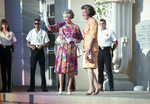 Queen Elizabeth II waves to a crowd of people outside of the Hall of State in Dallas with Dallas Mayor Annette Strauss on her left.