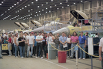 Assembly line workers stand in front of the F-16 Fighting Falcon assembly line at General Dynamics during a visit by Air Force Lt. Gen. Charles Horner to the Fort Worth plant.