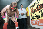 Wrestlers the Warrior [Jim Hellwig], left, and Arman Hussain [Mike Barber] stand outside of the arena next to the "Kow Bell Indoor Rodeo" [Kow Bell Arena] sign in Mansfield, Texas.