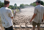 Spectators watch as the mud playing field is sprayed down with water during the Oozeball tournament at The University of Texas at Arlington.