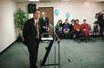Thomas Bruner, executive director of the new Arlington AIDS facility, say a few words at the ribbon-cutting ceremony. Program coordinator Viktor Anderson watches in the background. Published in Fort Worth Star-Telegram morning edition January 24, 1993.