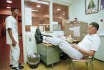 Dunbar High School head basketball coach Robert Hughes is pictured in his office, his feet propped up on his desk, speaking with one of his players.