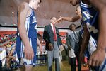 Dunbar High School basketball players are seen on the court during a game against Southwest High School at the Wilkerson-Greines Activity Center in Fort Worth. Dunbar head coach Robert Hughes is seen at center behind the players.
