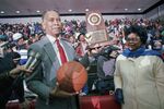 Dunbar High School basketball coach Robert Hughes is seen holding up a trophy celebrating 1,000 career basketball wins after a game, Dunbar vs. O.D. Wyatt, at the Wilkerson-Greines Activity Center in Fort Worth.