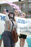 A clown is seen entertaining attendees at the annual Fort Worth Gay Pride Parade along South Jennings Avenue. The University of Texas at Arlington (UTA) Gay/Lesbian Association is seen marching with their banner in the background.