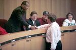 Image shows Arlington City Councilman candidate Harry Robinson, right congratulates District 1 Councilman, Elzie Odom, who defeated Robinson in the single-member election. City Manager George Campbell and Mayor Richard Greene, from left in background. Published in Fort Worth Star-Telegram Sunday edition May 8, 1994.