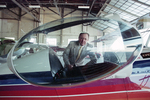 Auto dealer Charlie Hillard and his three-man aerobatic team are disbanding after 25 years on the air show circuit. Hillard is seen here peering through the bubble window of his aerobatic plane in a hangar at Fort Worth Meacham Airport.
