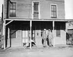Amon G. Carter, left, in Bowie, Texas, with unidentified man, undated. They are standing in front of a building. The man on the right is smoking a cigar.