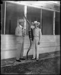 Amon G. Carter, left, with New York City major Jimmy Walker, holding a set of mounted steer horns at Shady Oak Farm; undated.