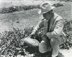 Amon G. Carter, Sr. and one of his "monogrammed" watermelons to President Hoover. Mr. Carter is kneeling beside a watermelon with the name "Hoover" written on it. He's smoking a cigar while wearing a suit and hat.