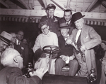 Amon Carter, putting a gun in a holster, entertains at his Shady Oak Farm. Attendees include Lyndon Baines Johnson and General Roger M. Ramey (standing to Johnson's right) and two seated unidentified men in what appears to be an early car. There is a crowd surrounding the men. General Ramey is in his military uniform. Mr. Carter is in a suit and a bowler hat. One of the seated men is wearing coveralls, heavy gloves, and a hat with goggles.