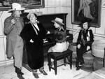 Amon G. Carter party for actress and columnist Elsa Maxwell. Amon Carter and Elsa Maxwell are standing next to each other and are singing. Both are dressed in Western attire. An unidentified woman is playing an upright piano. On the right side of the piano is Nenetta Burton Carter, also dressed in Western clothes. Mr. Carter is holding a pistol.