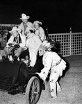 Amon G. Carter party for Elsa Maxwell held at Carter's Shady Oaks farm. In this photograph we see Ms. Maxwell sitting in the front passenger's seat of an open automobile. The driver is unidentified. Mr. Carter is in the back seat behind the driver; an unidentified woman is sitting behind Ms. Maxwell. Additionally, there is a man costumed as a Native American standing alongside the car. Everyone in the automobile is laughing and wearing overcoats and cowboy hats. The costumed man is wearing a feathered head dress and buckskin clothing.