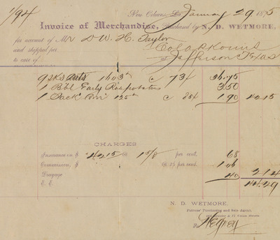 Invoice of merchandise from N. D. Wetmore for Duncan William Henry Taylor