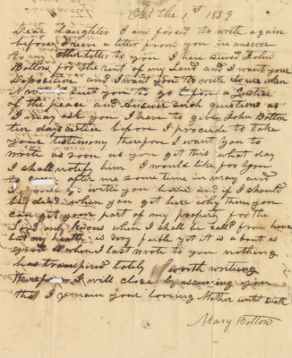 A letter from Mary T. Bolton to daughter Leodocia B. Darby. Envelope from the letter.
