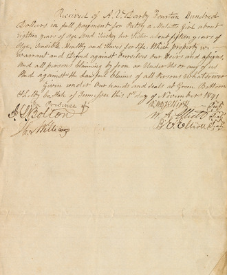 Bill of sale from W. A. Elliot to A. V. Darby for the enslaved peoples, Patsy and Lucky.