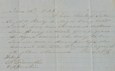 Bill of sale from George W. Goff to A. V. Darby for payment of enslaved person, Jack.