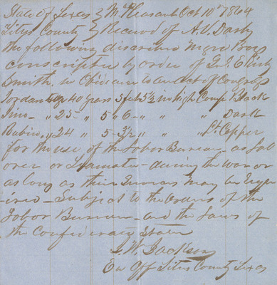 Confederate State Act (CSA) conscription receipt for enslaved people; Jordan, Jim, and Ruben.